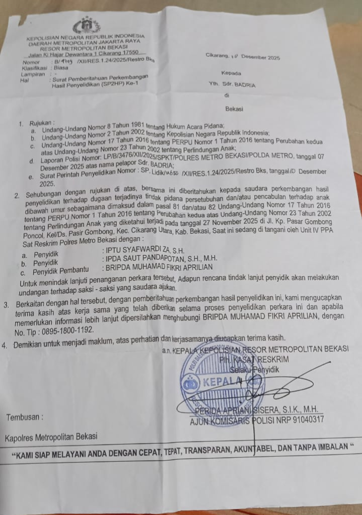 Dengan nomor pelaporan LP/B/3476/XII/2025/SPKT/POLRES METRO BEKASI/POLDA METRO.