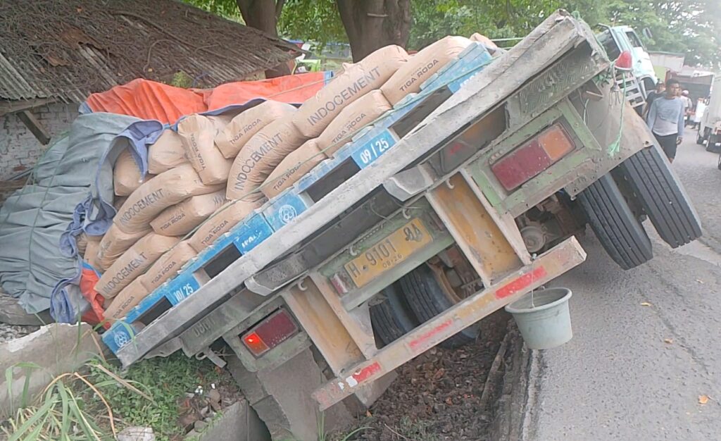 Mobil Kontainer Angkutan Semen Amblas di Bekas Galian Kabel Jalan Raya Pasir Gombong