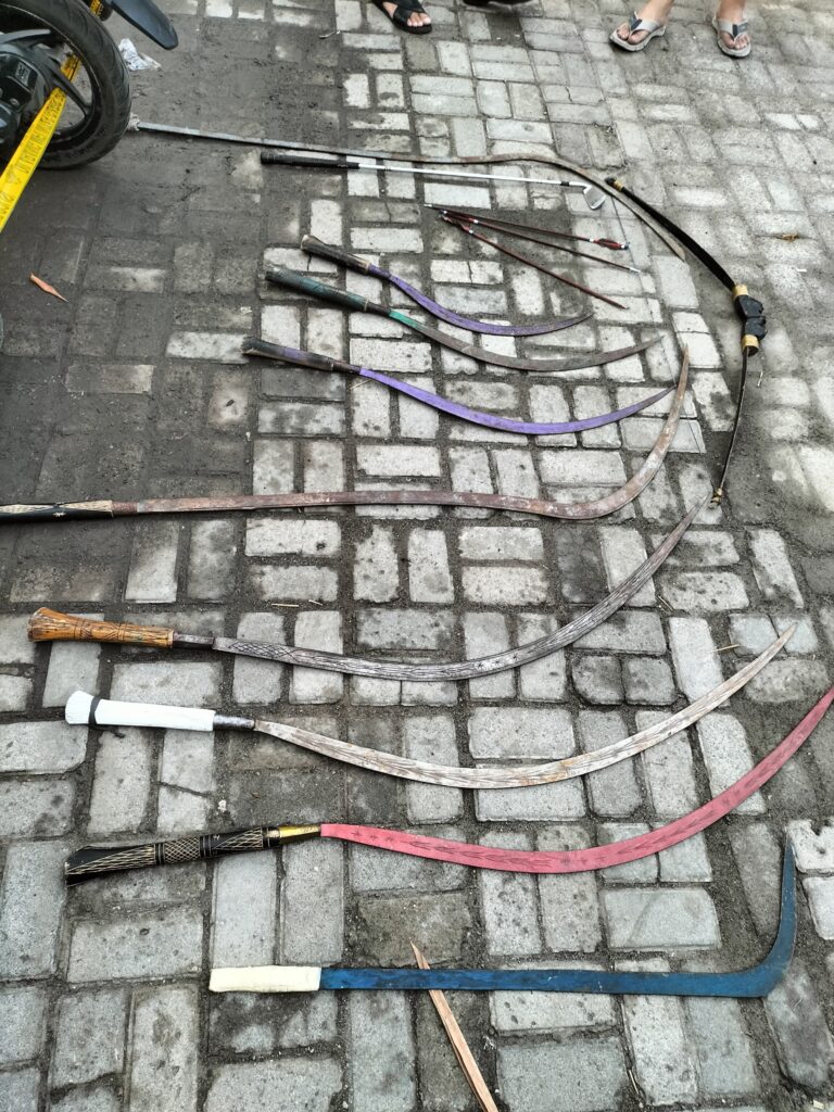 Di lokasi kedua di gang Al Mabrur kebalen, situasinya lebih serius. Polisi menemukan 11 sepeda motor yang ditinggalkan dan berbagai senjata tajam, antara lain: